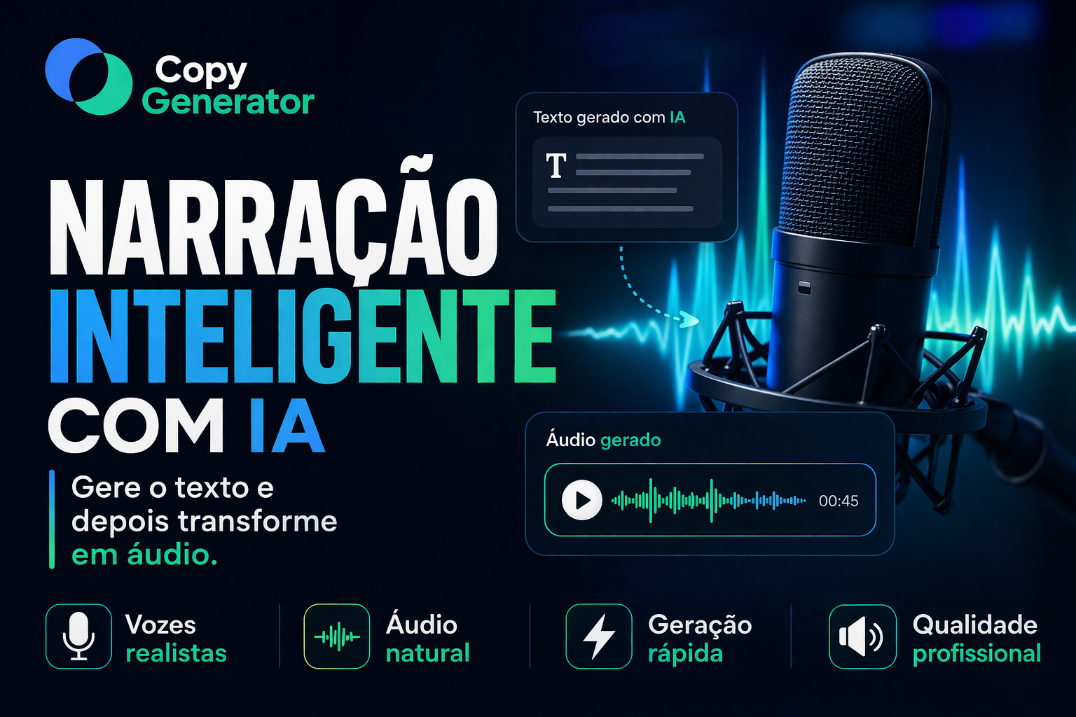 A produção de conteúdo evoluiu — e quem ainda depende de gravações manuais, locutores caros ou horas de edição está ficando para trás. Com o Copy Generator, você não só cria textos persuasivos, como também transforma qualquer roteiro em áudio profissional em segundos.